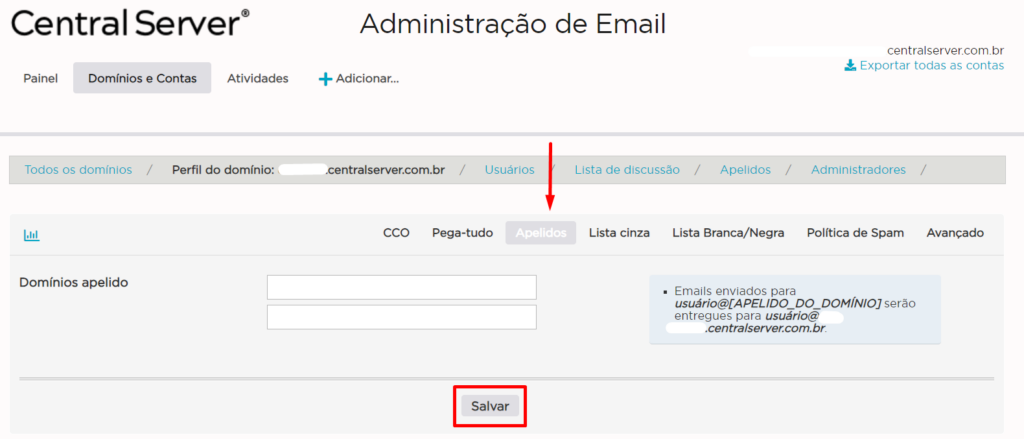 3 – Clique em Apelidos e insira o nome do domínio que deseja adicionar, posteriormente cliquem em Salvar.