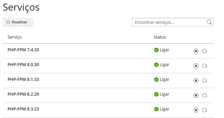 - Serão listados todos os serviços disponíveis (Apache, MySQL, Mail, etc). Os serviços que estão em execução estarão com o status “Em execução” ou “Running”.