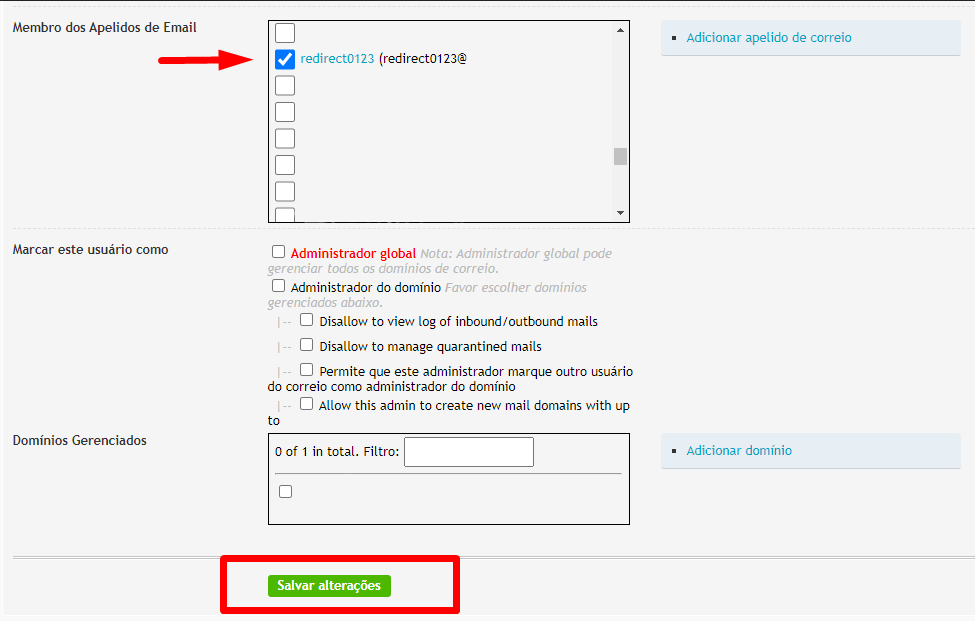 5 – Selecione o redirecionamento desejado no campo “Membro dos Apelidos de Email“