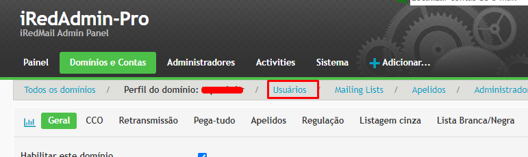 3 – Após clicar no seu domínio, selecione a opção “usuários” no canto superior.