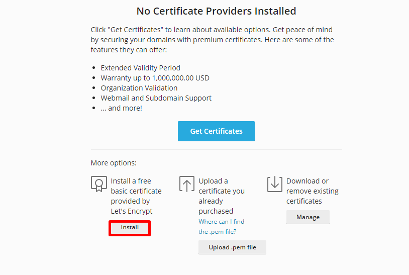 2. Clique na opção “Install” na seção do Let’s Encrypt.