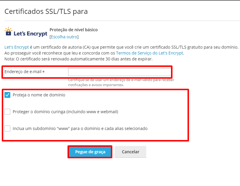 3. Insira um endereço de e-mail para receber avisos sobre o certificado, marque o checkbox das opções que mais se adequa ao seu uso (recomendamos marcar apenas o primeira) e clique em “Pegue de graça”.