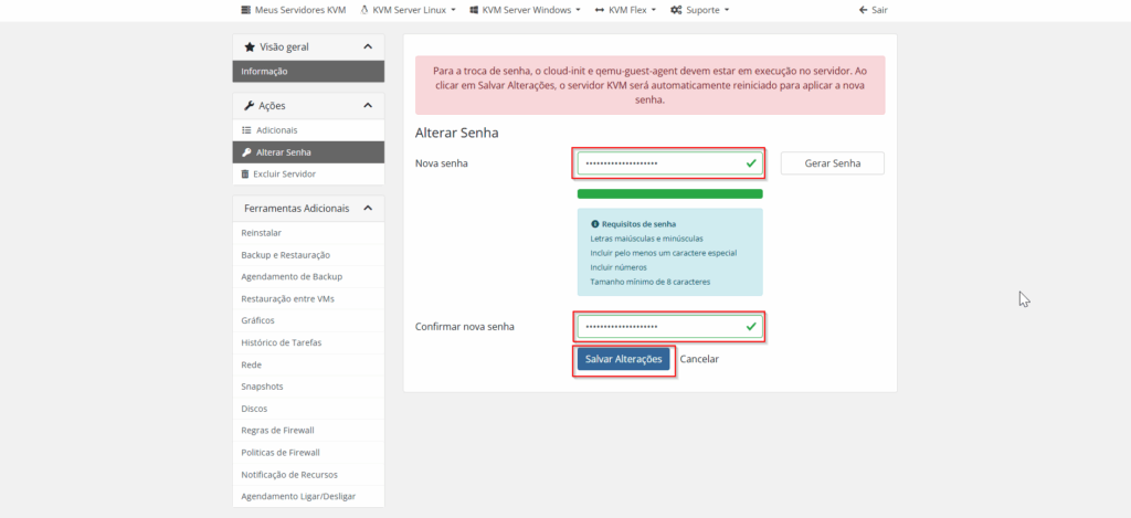 Preencha com a nova senha e em seguida confirme novamente a senha, e clique em “Salvar Alterações”. *