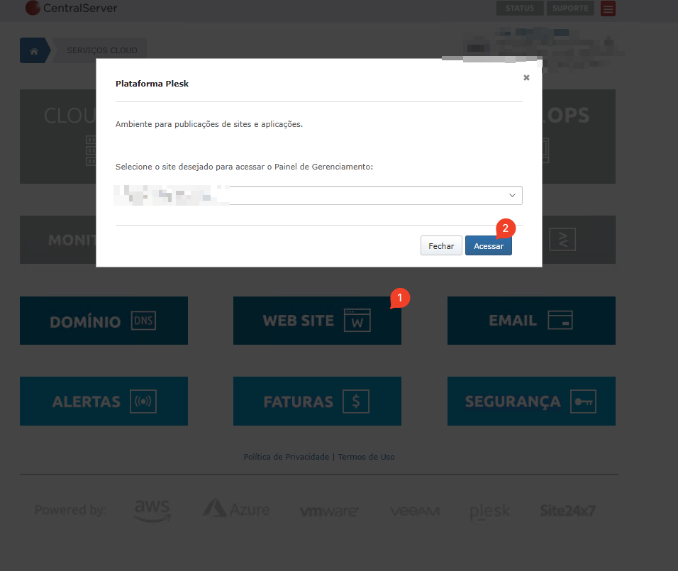 - Por meio do Console Cloud realizar acesso à opção web site (1), em sequência selecionar o domínio (caso possua mais de um domínio) e clicar na opção acessar (2). Onde será aberto em uma nova guia/aba do navegador seu painel plesk;