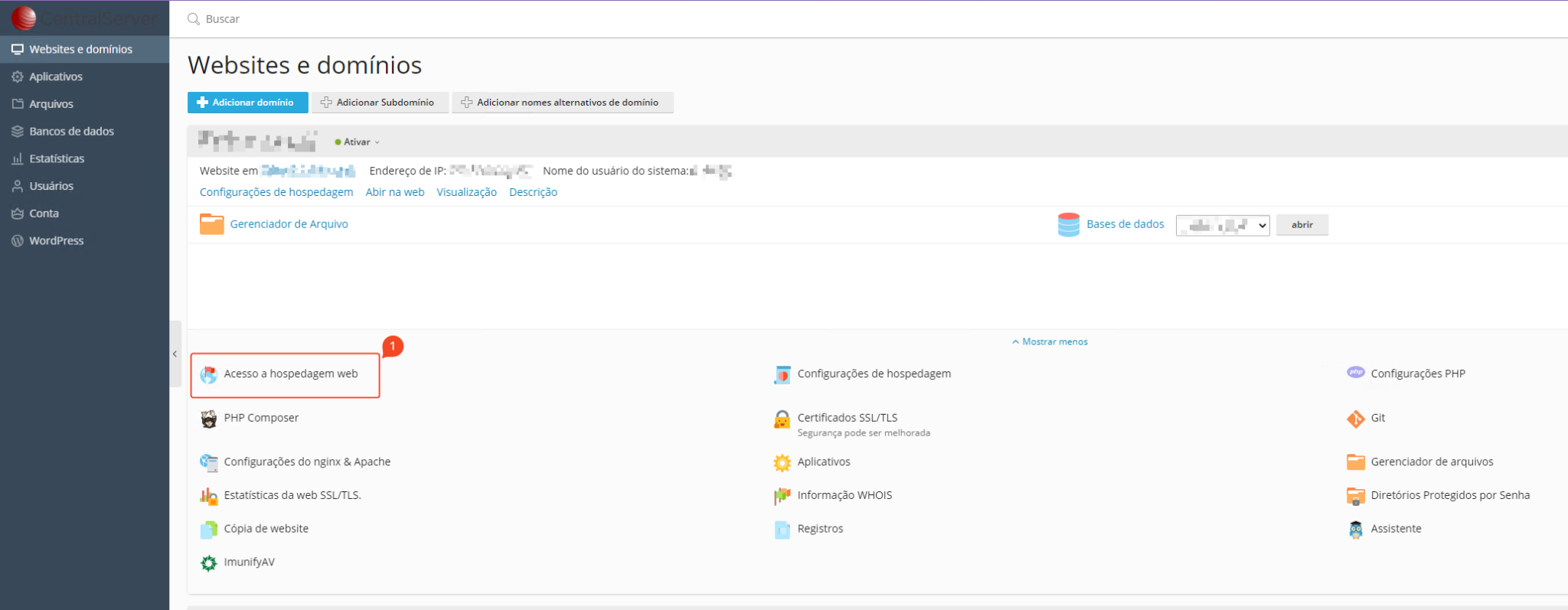 - No painel plesk, selecionar a opção Acesso à hospedagem web (1);