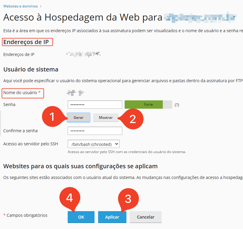 - Nesta tela é possível visualizar o nome de usuário para acesso via FTP, o IP de conexão, bem como realizar a redefinição da senha de acesso. Para a redefinição de senha deve-se clicar em gerar (1) em seguida em mostrar (2) para que a senha seja exibida e possa ser copiada, e por fim utilizar as opções aplicar e OK (3 e 4), para salvar e concluir o processo.
