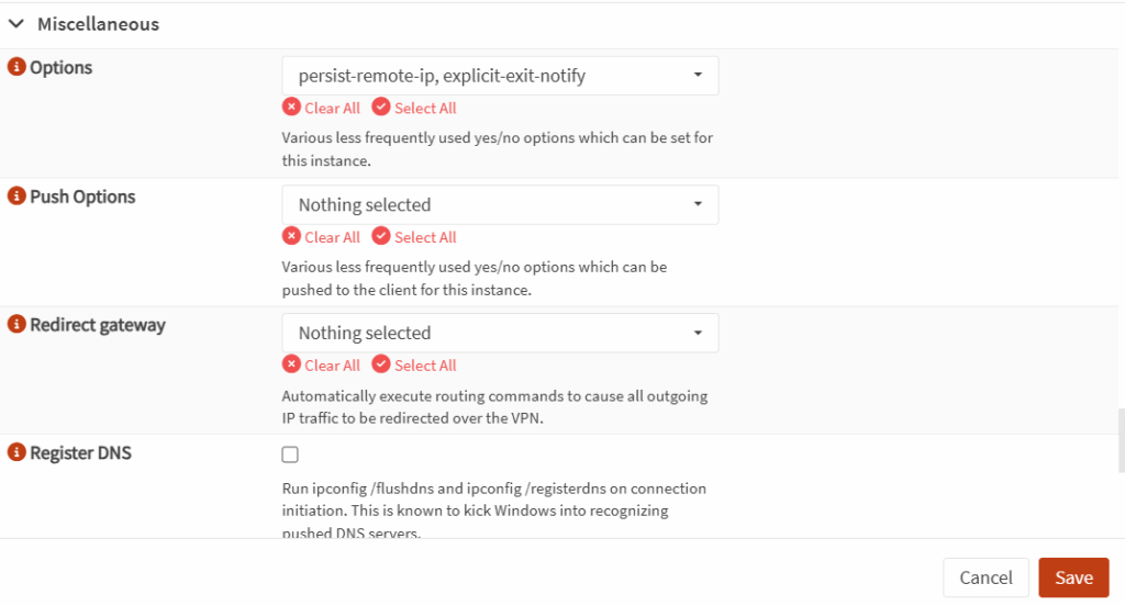 - (opcional) Configure DNS, NTP e redirect gateway caso deseje que todo tráfego do cliente passe pela VPN.