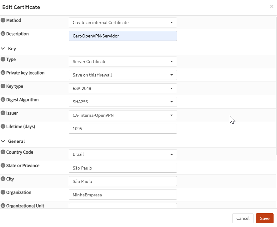 - Preencha os campos necessários (nome descritivo, tamanho da chave, algoritmo de assinatura, validade etc.).