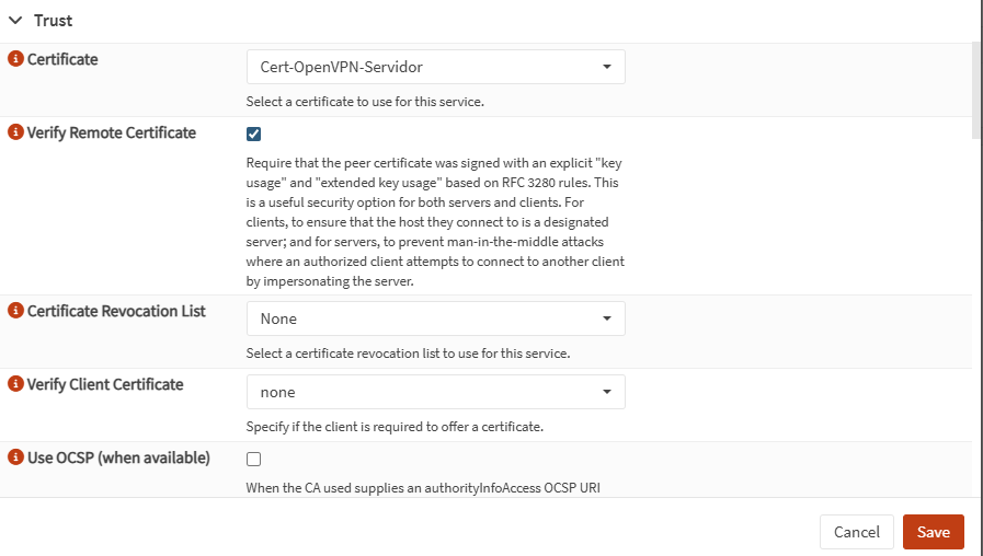 - Certificate: selecione o certificado do servidor (criado em System → Trust → Certificates)