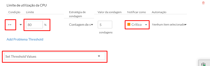 4. Na parte “Set Threshold Values” selecione “Limite de utilização da CPU” e altere os valores conforme o desejado: