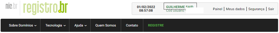 Passo 01 – No painel da sua conta no Registro.br, clique sobre o seu nome para ter acesso à aba de domínio e titularidade:
