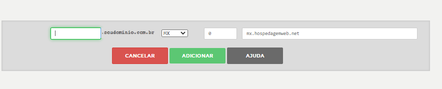 Crie um apontamento do tipo MX com entrada em branco para o mx.hospedagemweb.net, no campo do meio coloque 0 conforme o exemplo abaixo: