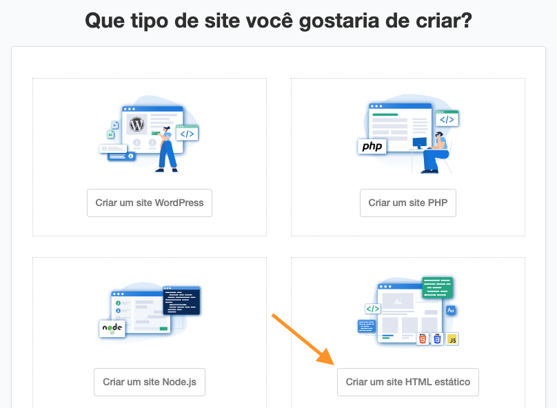Na tela “Que tipo de site você gostaria de criar?”, selecione: “Criar um site HTML estático”: