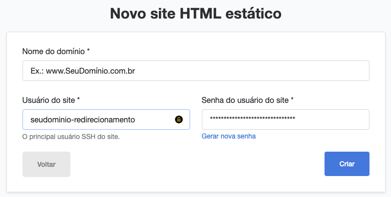 Na tela seguinte, informe os dados do site a ser criado, por exemplo: