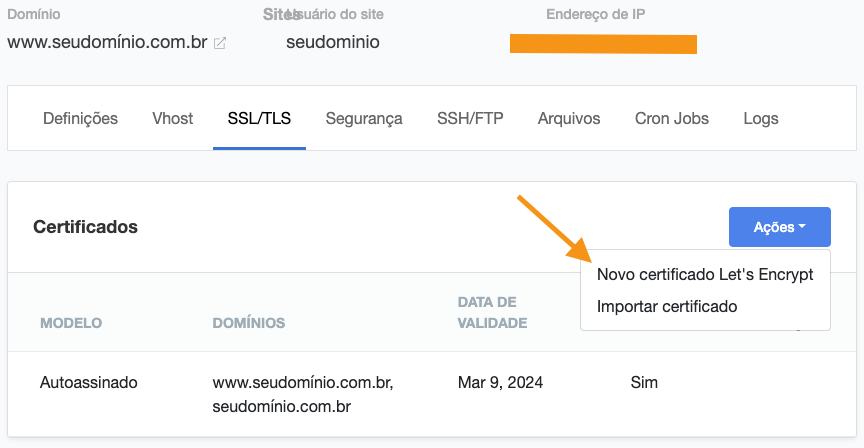 Em seguida, o CloudPanel vai mostrar a lista de sites criados no servidor. Selecione o link “Gerenciar” na linha correspondente ao site e, em seguida, clique na aba “SSL/TLS” para configurar o certificado seguro (HTTPS):