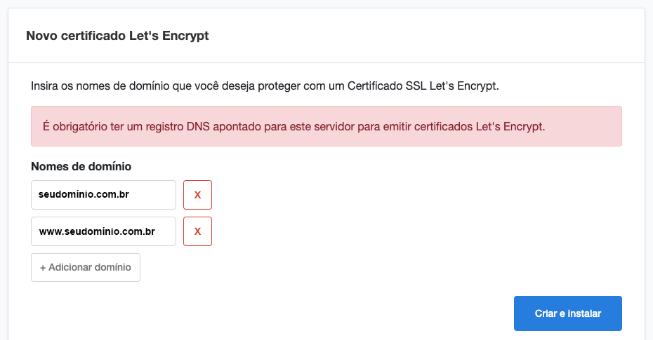 Na tela Novo certificado Let’s Encrypt, informe os nomes de domínio que deseja proteger e clique em “Criar e instalar”: