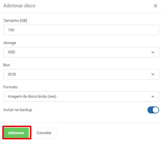 - Tamanho do Disco (GB): Defina o espaço desejado, como por exemplo 50GB, 100GB conforme contratado anteriormente.