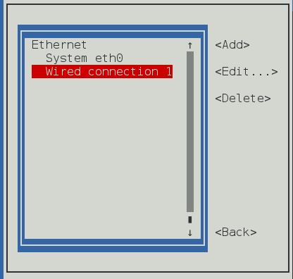 4.2 Conforme podemos identificar na imagem acima, a nova placa de rede não teve seu IP atribuído automaticamente, portanto, neste caso, vamos utilizar o nmtui para realizar a configuração da mesma. Rode o comando “nmtui” no terminal e selecione a primeira opção para realizar a configuração: