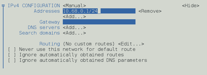 4.3 Defina as configurações de IPv4 como “Manual” e defina o endereço IP conforme preferir, lembrando que as máquinas devem estar dentro do mesmo range de IP (neste caso, vamos inserir 10.68.0.1/24):