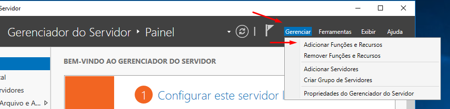 1 – Abra o Gerenciador do Servidor → Gerenciar → Adicionar Funções e Recursos
