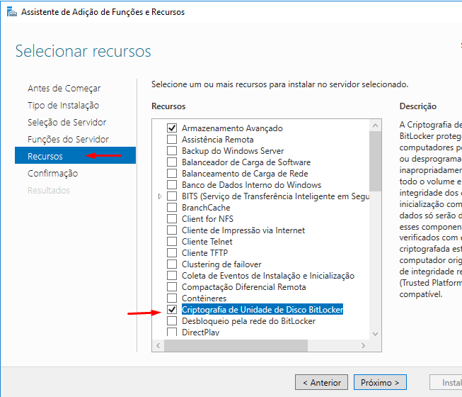 2 – Avance até o menu Recursos e marque a opção: “Criptografia de Unidade de Disco BitLocker”