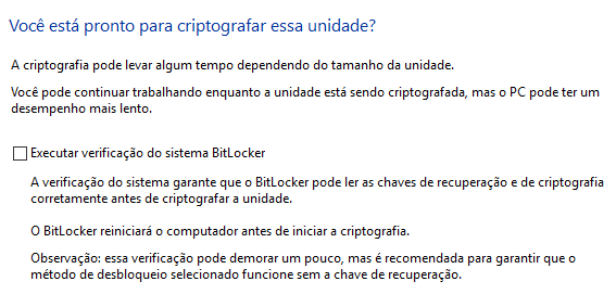 Para garantir o processo de criptografia, pode marcar a opção abaixo para que o assistente realize verificações de recuperação.