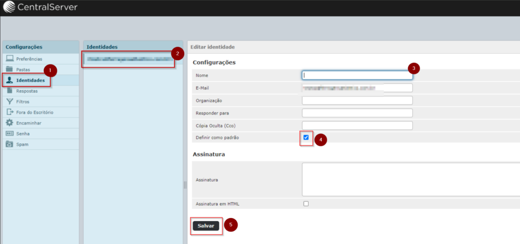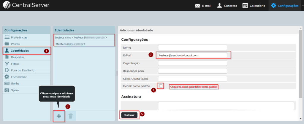 Em seguida, clique em “Identidades”, selecione o domínio extra, caso não possuir, clique no ícone “+” para adicionar em seguida configure com o nome e clique em salvar conforme imagens abaixo: