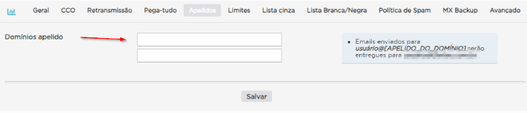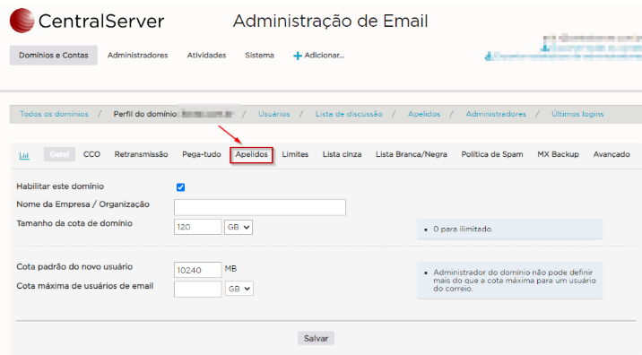 No painel de administração, clique em seu domínio e em seguida em “apelidos“:
