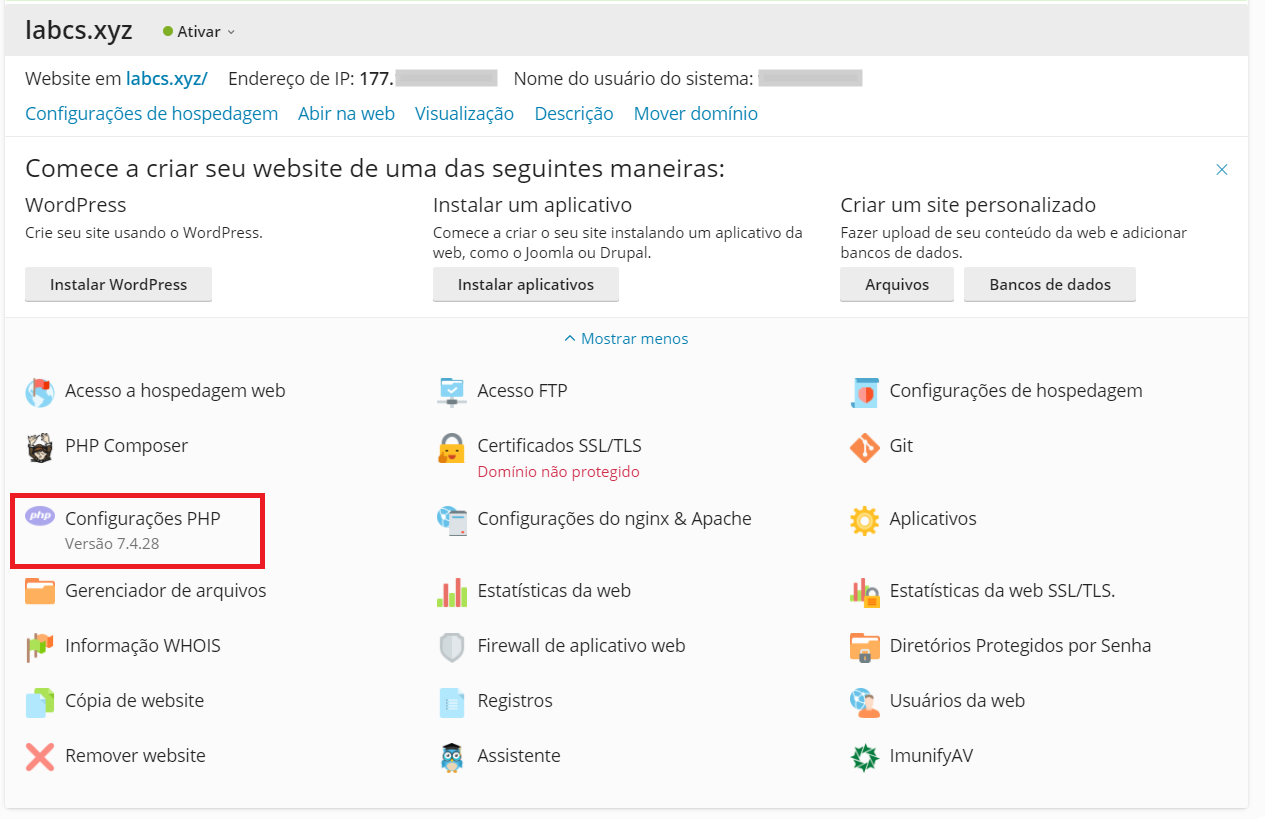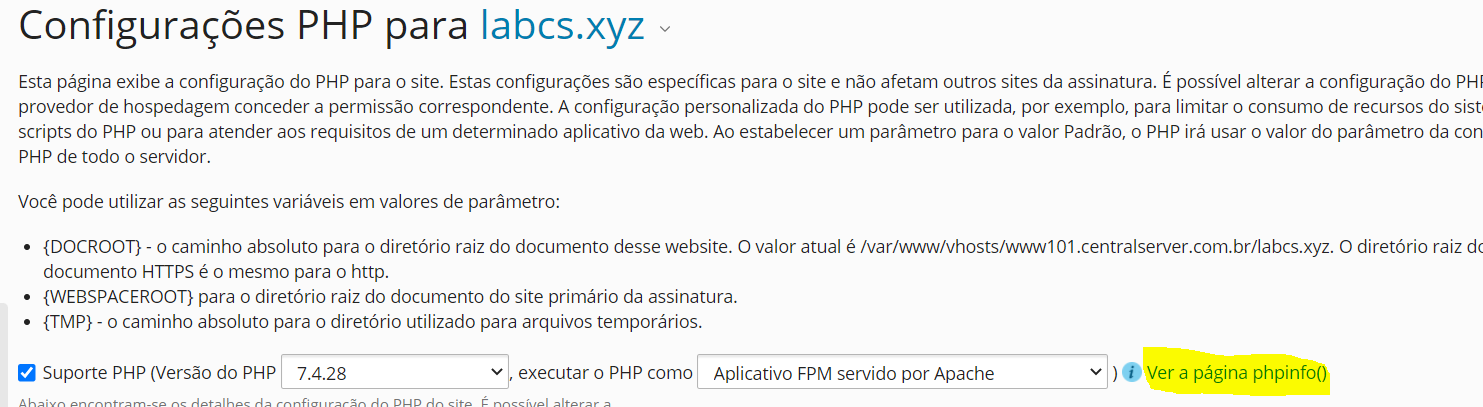 Para visualizar as configurações do PHP atualmente configuradas para o domínio, incluindo aquelas configuradas no nível do servidor, clique no link “Visualizar a página phpinfo()”, mostrado na figura abaixo: