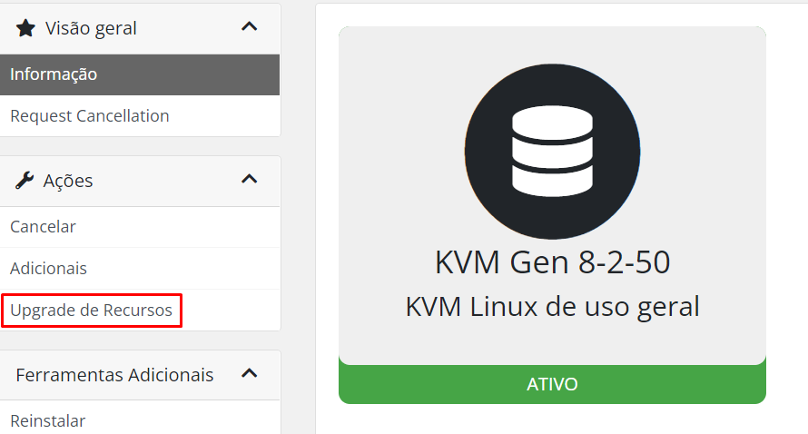 1. Na página inicial do painel KVM, aba Informações do Servidor clique na opção Upgrade de Recursos.