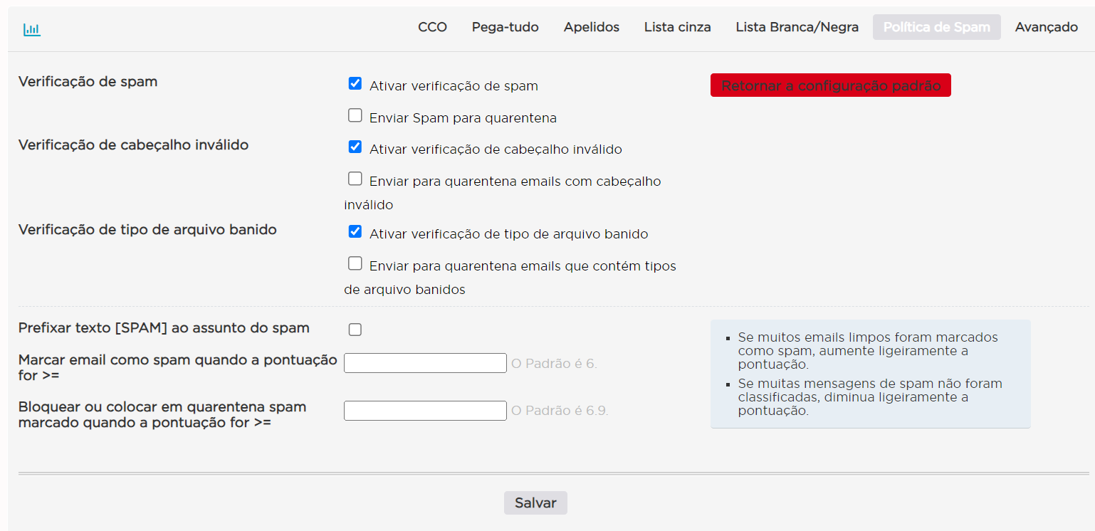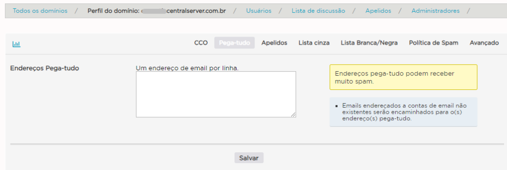 - Endereços Pega-Tudo: Um endereço de e-mail por linha, que será o destino dos e-mails enviados para contas inexistentes.