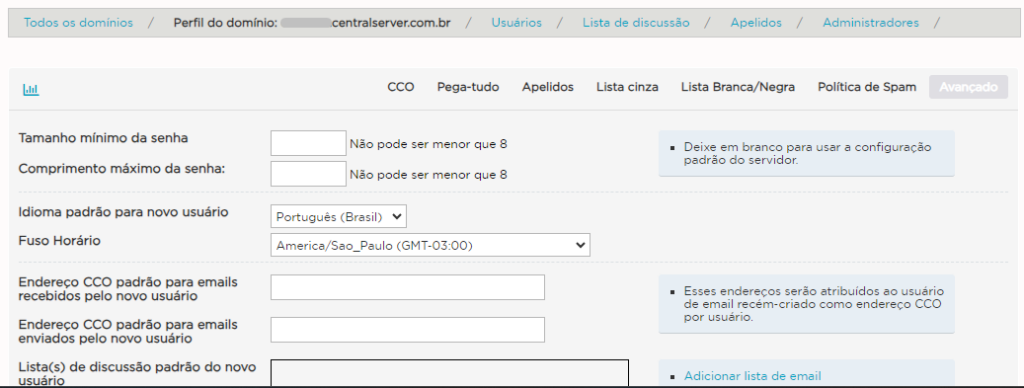 Neste procedimento, vamos explicar como configurar as opções de CCO, Pega-Tudo, Apelidos de Domínio, e os recursos avançados para administração de contas de e-mail.