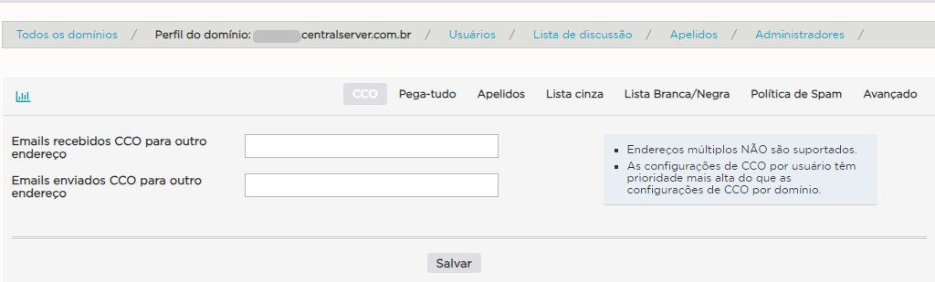 Para mais informações verifique o guia Como configurar o CCO na Administração de E-mail?