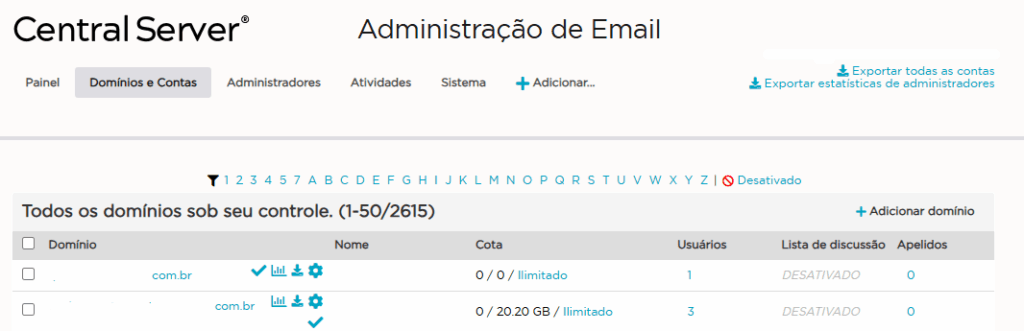 Após realizar o login na administração de e-mail, será exibido Domínios e Contas, aqui será listado os domínios existentes no servidor: