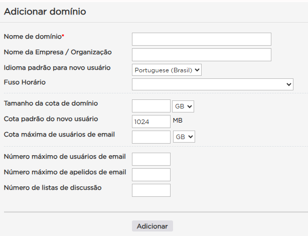 - Cota padrão do novo usuário: Espaço (em MB) atribuído automaticamente a cada nova conta de e-mail.