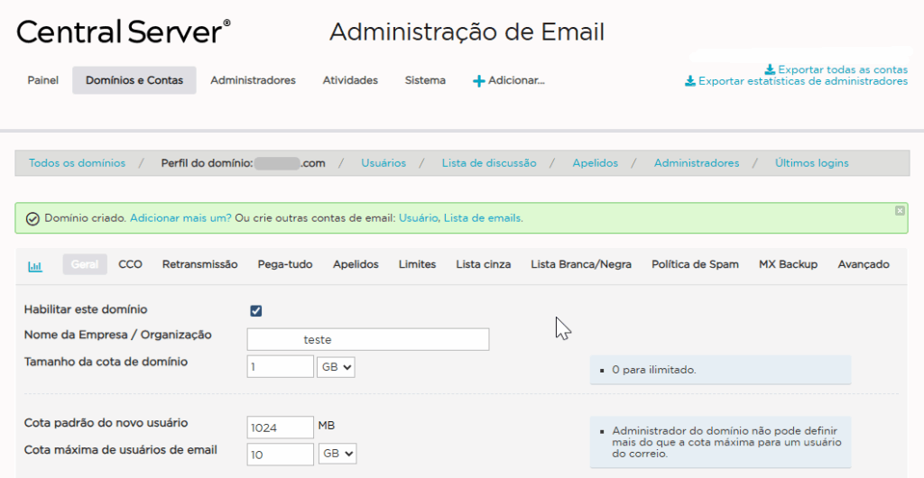 - Número máximo de usuários de e-mail: Limita quantas contas podem ser criadas no domínio.