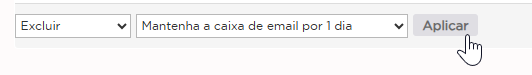 Para excluir um domínio, acesse a página onde eles são listados, marque o domínio que deseja excluir, escolha a ação Excluir, defina por quanto tempo as caixas ficarão salvas e clique em Aplicar: