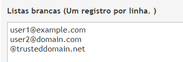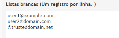 No exemplo acima, qualquer email enviado por user1@example.com, user2@domain.com ou de qualquer endereço dentro do domínio trusteddomain.net será permitido.