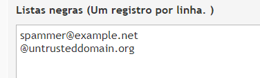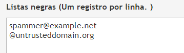 No exemplo acima, qualquer email enviado por spammer@example.net ou de qualquer endereço dentro do domínio untrusteddomain.org será tratado de acordo com as configurações definidas para a lista negra, ao qual será encaminhado para a quarentena por padrão.