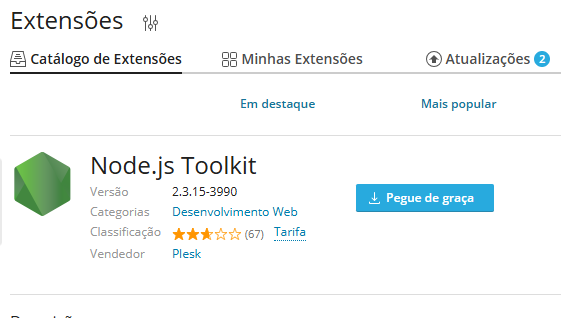 Antes de hospedar aplicativos Node.js, é necessário instalar a extensão gratuita Node.js Toolkit. Siga os passos abaixo: