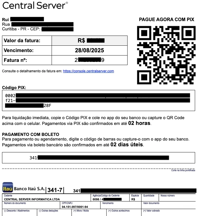 Boletos emitidos pela CentralServer para pagamento de serviços de computação em nuvem possuem as seguintes informações: