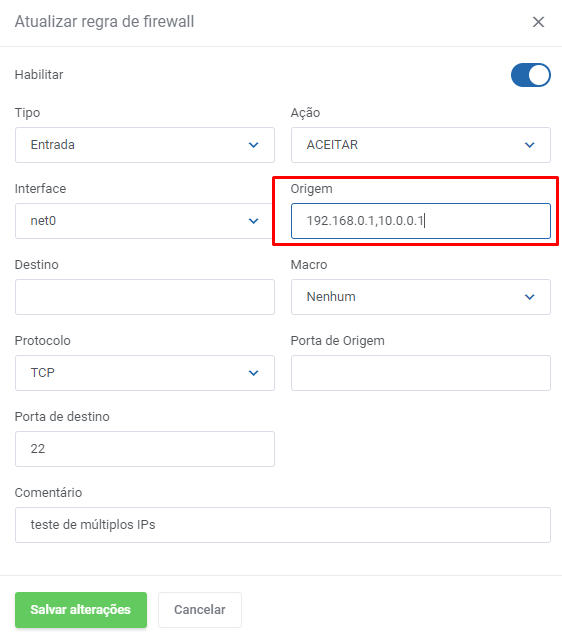 Veja como inserir múltiplos IPs de origem para uma regra no firewall do KVM Server.