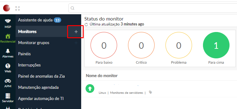 - Tendo realizado acesso em sua entidade no https://www.site24x7.com/ clique no botão + em monitores: