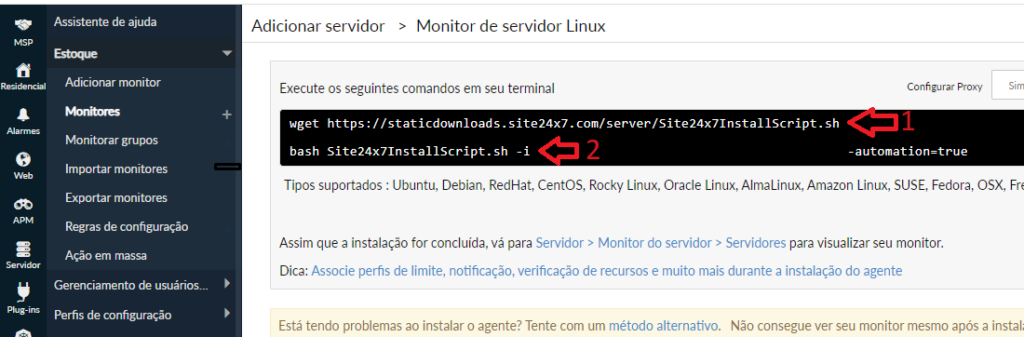 - Copie e execute em seu servidor os comandos em destaque, onde será realizado a instalação do agente de monitoramento juntamente com a vinculação do agente a sua entidade (via a key disponível na segunda linha do comando):