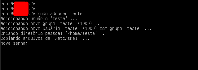 - É necessário a criação de um usuário sem privilégios para que no reboot do servidor, quando a mesma iniciar já com a interface gráfica, possa logar no ambiente gráfico (não pode ser o usuário root). Execute o comando: adduser “NomeUser”, substituindo “NomeUser” pelo desejado. Será solicitado a criação de uma senha e é importante guardá-la para efetuar o acesso ao servidor no futuro.
