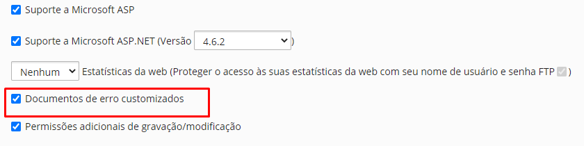 2. Ative a opção de Documentos de erro customizados em Configurações de hospedagem no seu painel plesk, conforme imagem abaixo