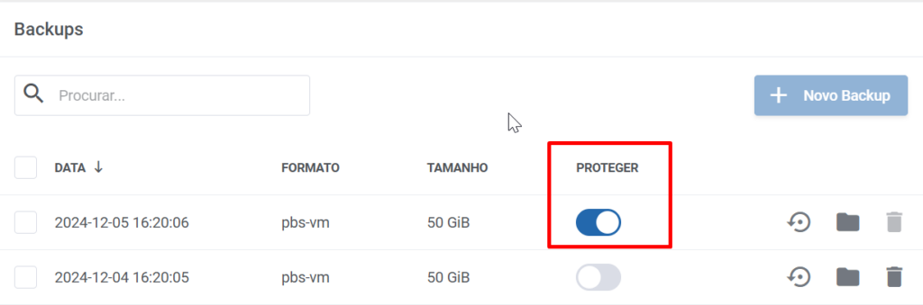 Nota: Backups protegidos não podem ser excluídos, garantindo a integridade dos dados.
