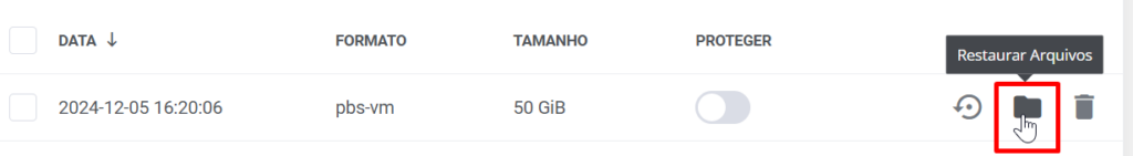 7 – Na lista de backups disponíveis, localize aquele que contém os arquivos que deseja restaurar. Clique no botão com o ícone de pasta ao lado do backup, identificado como Restaurar Arquivos.