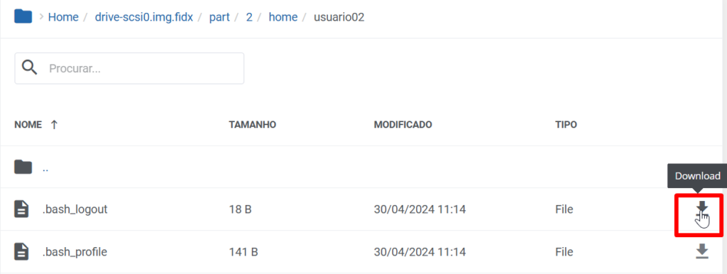 8 – Será aberta uma nova tela exibindo o conteúdo do backup, incluindo diretórios e arquivos. Utilize a barra de pesquisa ou navegue pelos diretórios para localizar o arquivo desejado. Ao lado de cada arquivo, haverá um botão com o ícone de download.