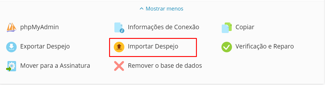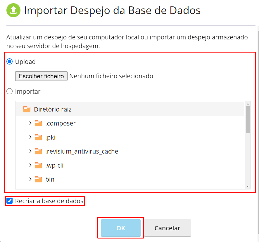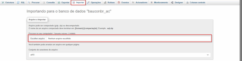 Clique em Importar, selecione Escolher arquivo e carregue o dump das tabelas.